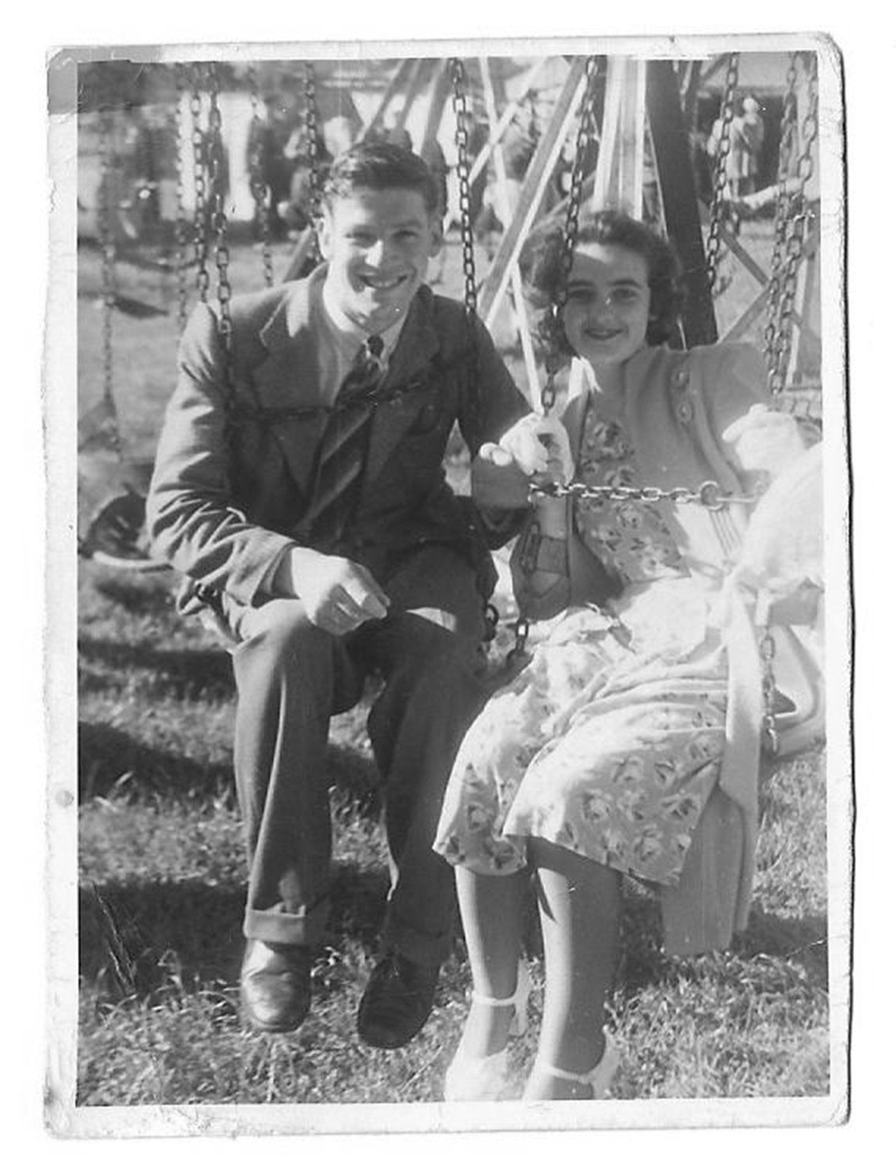 Lionel Jones, aged 18, and Patricia Reilly, aged 16, on the swings in the Koroit Gardens in 1948